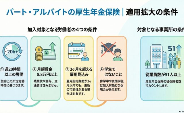 労働社会保険諸法令の基礎知識 パート・アルバイトの厚生年金保険適用拡大を解説 2024年10月から、従業員数51人以上の事業所では短時間労働者への社会保険適用が拡大されました。対象となる要件を正しく理解し、適切な対応が必要です。適用対象となる労働者の4要件短時間労働者が厚生年金保険の加入対象となるには、以下の4つの要... 労働社会保険諸法令の基礎知識