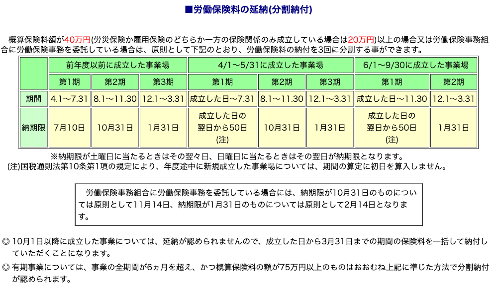 分割回数の制限 保険関係の成立時期によっては、2期に分割または延納不可となる場合があります。