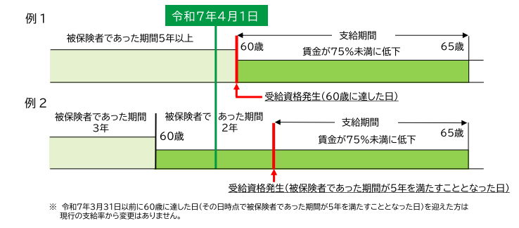 例2のように、令和7年3月31日以前に60歳に達した方であっても、令和7年4月1日時点で被保険者であった期間が5年以上ない方は、令和7年4月1日以降に60歳に達した方と同様に縮小された支給率になります。