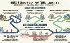 - 通勤中の災害(こちらは「通勤災害」として別途扱われます)
