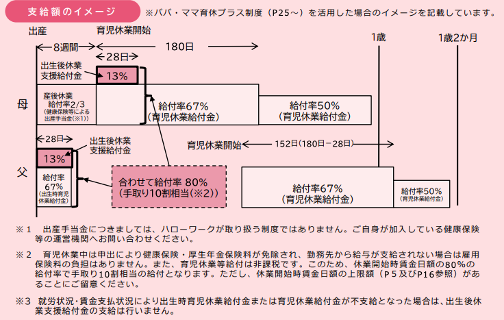 給付率を13%分引き上げ(67%→80%)父母がともに14日以上休業した場合に適用