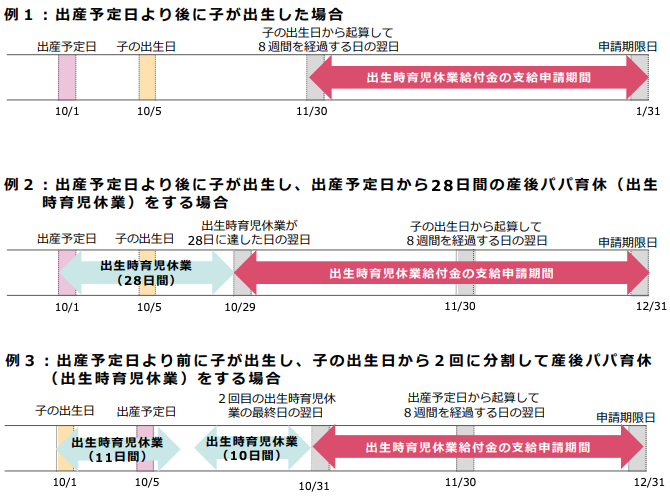 支給申請は、申請開始日から2か月を経過する日の属する月の末日までに行わなければなりません。なお、出生時育児休業は2回に分割して取得できますが、申請は1回にまとめて行います