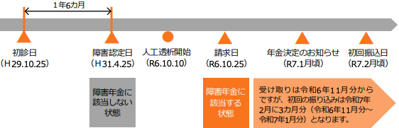 これは、障害認定日(原則として初診日から1年6か月後)の時点では障害等級に該当しなかったものの、その後65歳までに障害が重くなり1級・2級(障害厚生年金のみ3級も含む)に該当した場合に請求できる制度です。請求日の翌月分から年金が支給開始されます。