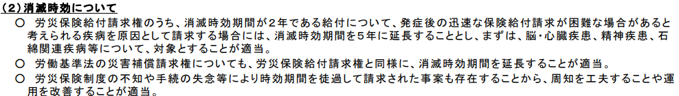 さらに、労働基準法の災害補償請求権も同様に時効延長が適当であるとのことでした。