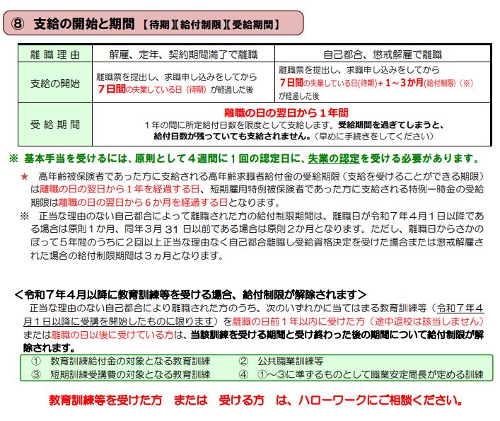 さらに、正当な理由のない自己都合退職の場合は原則1か月間(2回目以降は3か月間)、懲戒解雇の場合は3か月間の給付制限があります。